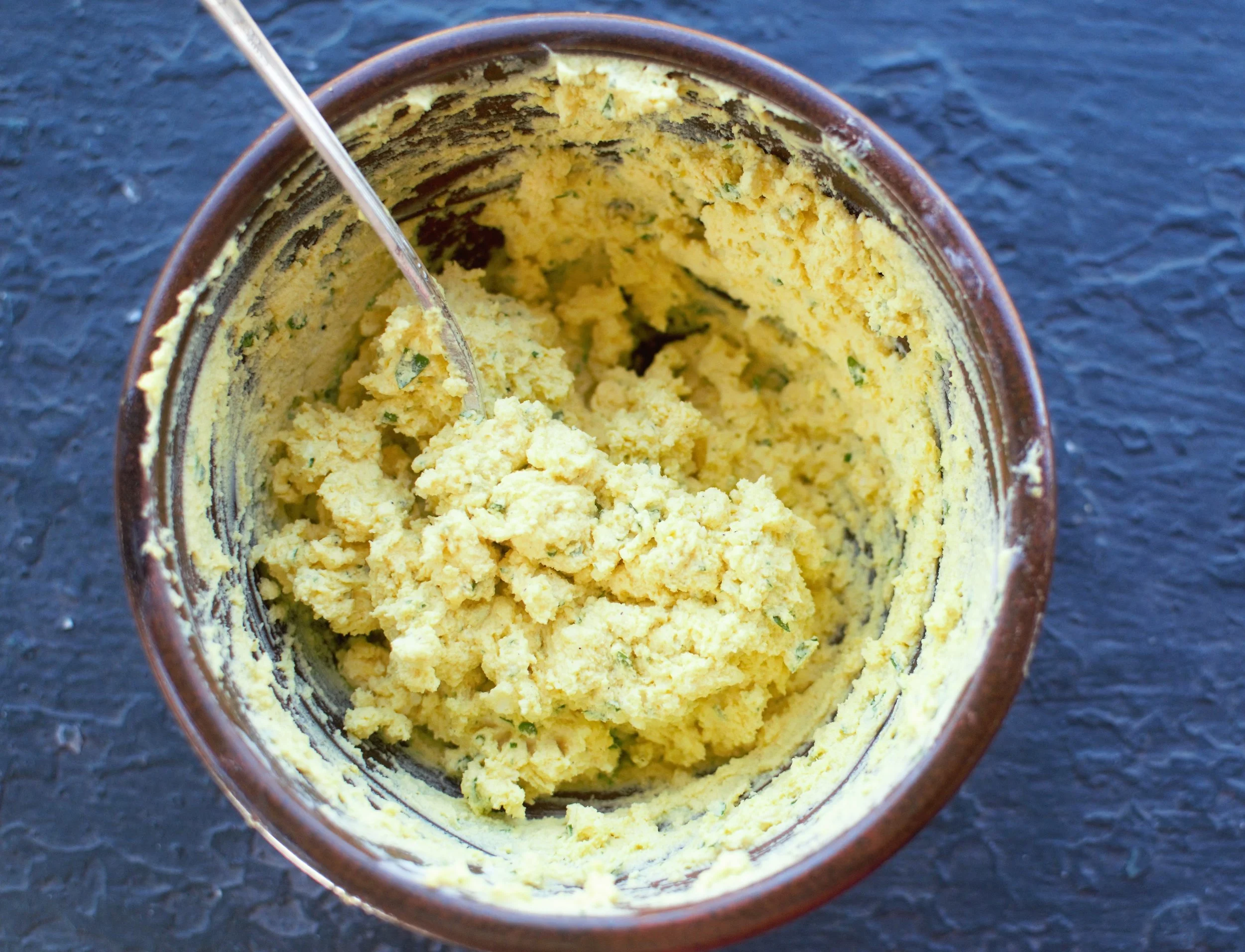 Peel eggs, and slice in half longways. Remove yolks and combine in a bowl with mayo, butter, vinegar, herbs, salt, sugar, mustard, and pepper.
